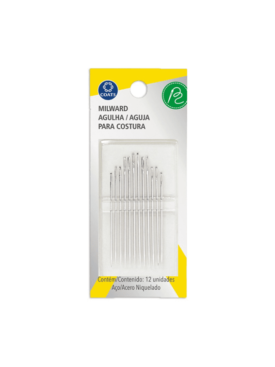 Cartela com 12 agulhas para costura manual de aço niquelado.