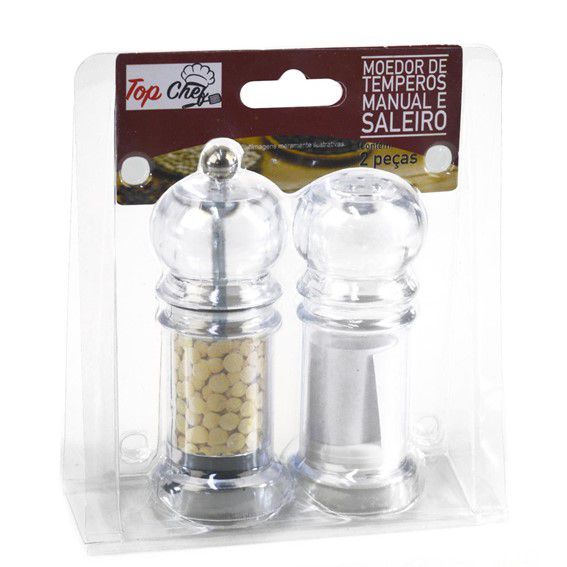 Kit com 1 moedor de temperos manual, de acrílico e 1 saleiro de acrílico.