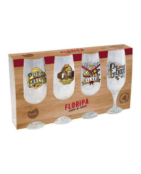 Jogo com 4 taças de vidro com capacidade até 300ml cada, com estampas relacionadas aos tipos de cerveja.